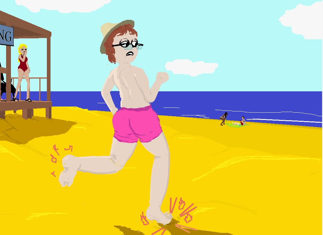 He leaped from tiptoe to tiptoe, sacrificing one foot after the other to pull the previous one away from harm. It was like tap-dancing on a hot, sandy stovetop, and the parasol he was running toward had somehow moved much further away. He kept his teeth clenched together, determined to keep himself moving forward as quickly as possible without risking his balance on the rippling dunes; if dashing across the sand was this painful, he didn't even want to think about faceplanting into it! The parasol was getting closer, but not fast enough. Grimacing even harder, wondering if he was actually burning his skin by doing this, Zach broke into an outright run, or the closest thing one can do to running using only one's tiptoes. A couple of other beachgoers winced in sympathetic pain, or just surprise, as he bounced passed them. In the background, he heard the lifeguard whistle at someone to get out of the water or something. To Zach, these things were all immaterial; he just needed to get off the sandy stovetop!